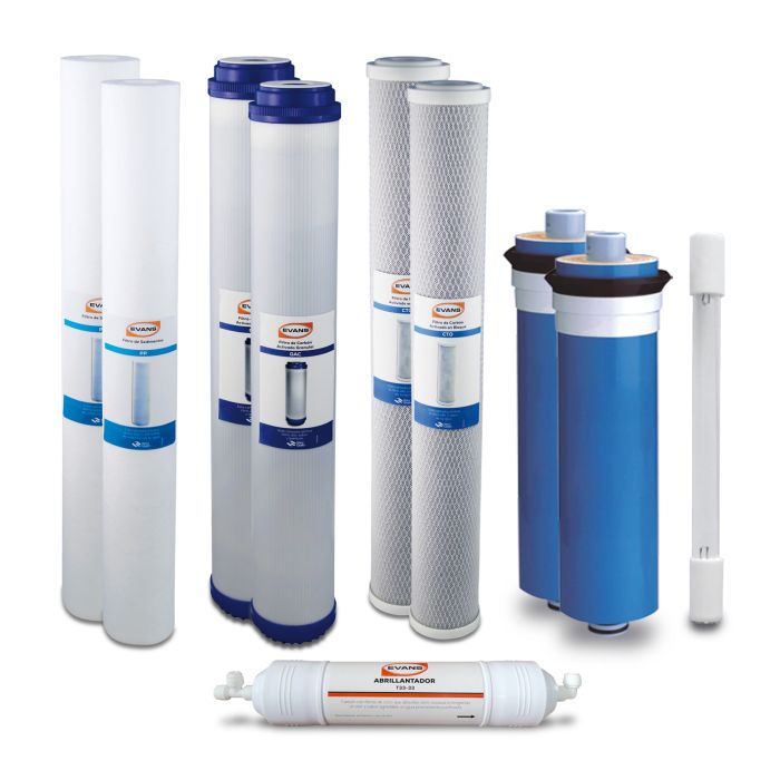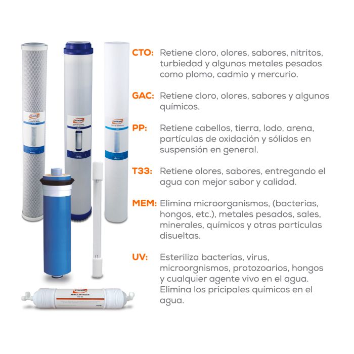 • Cartucho Polipropileno PP-20 (2 piezas) • Cartucho carbón activado granular GAC-20 (2 piezas) • Cartucho carbón activado en bloque CTO-20 (2 piezas) • Membrana Ósmosis Inversa MEM-600G (2 piezas) • Abrillantador T33-33 (1 pieza) • Lámpara UV LAMPUV-12W (1 pieza) |