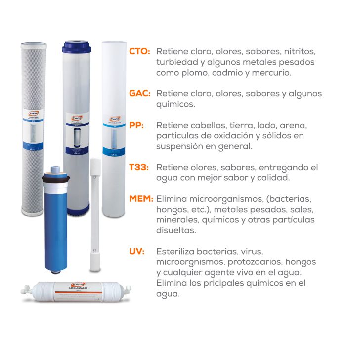 • Cartucho Polipropileno PP-20 (2 piezas) • Cartucho carbón activado granular GAC-20 (2 piezas) • Cartucho carbón activado en bloque CTO-20 (2 piezas) • Membrana Ósmosis Inversa MEM-100G (2 piezas) • Abrillantador T33-33 (1 pieza) • Lámpara UV LAMPUV-6W (1 pieza) |